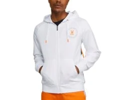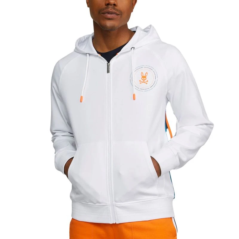 Our men’s Ovington zip up hoodie offers a vibrant pop this summer. The Ovington zip up is crafted from only the softest cotton fleece and finished with our trusted trimmings: rubber-tipped drawstrings at the hood, kangaroo pockets, ribbed cuffs, a structured hood and a full-length metal zipper with embossed Psycho Bunny detailing. The Ovington features ribbed side panels, finished with multicolor stripes that match the taping inside the hood. An embroidered Psycho Bunny logo is ringed by Psycho Bunny detailing, with the colors used also matching those on the stripes. With its vibrant colors and bold detailing, the Ovington offers an expressive take on the classic zip up hoodie.